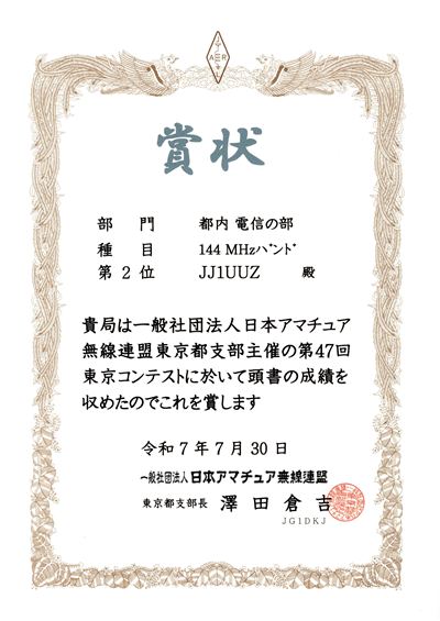 18 | 2025年 | 7月 | 第47回東京コンテスト 都内 電信の部 144MHzバンド 2位の賞状を頂きました。 |